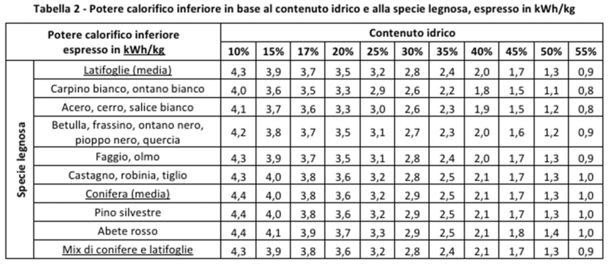 Tabella sul potere calorifico netto e di come sia più conveniente prendere un cippato in classe A1 con il 20% di umidità rispetto ad uno con umidità più alta (40%) e una resa dimezzata.